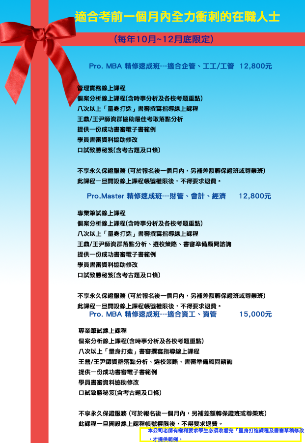 ▊Pro. MBA 精修速成班---適合資工、資管 NTD15,000元(未稅)